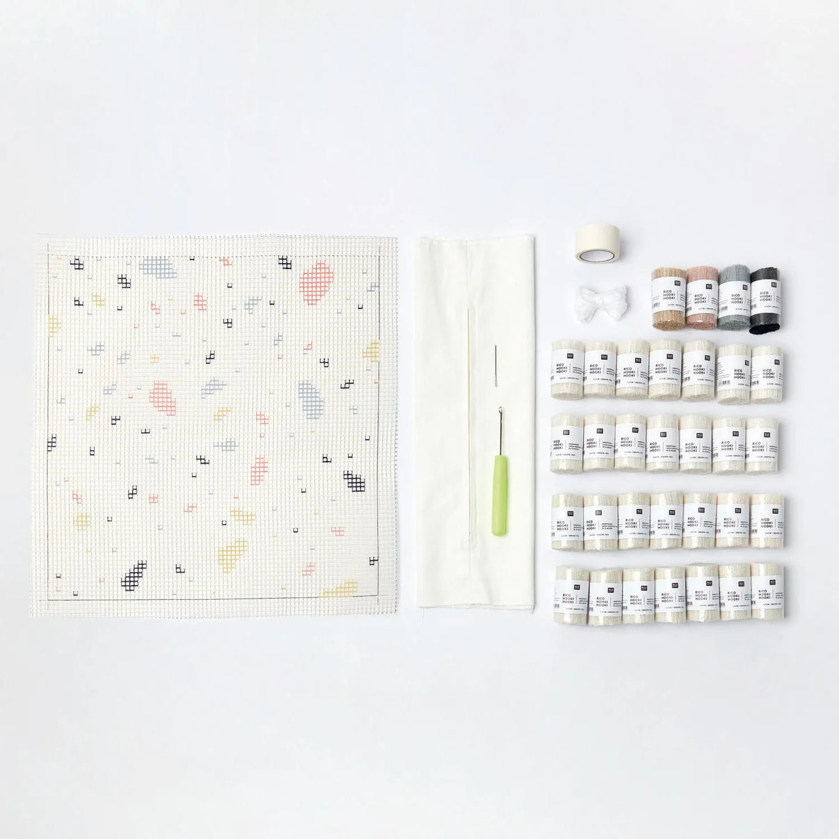 Im Set ist alles enthalten, was du brauchst: feines, bedrucktes Knüpfgewebe, ein 3 mm Knüpfhaken, hochwertiges Garn sowie Zubehör wie Nähgarn, Abschluss-Tape und eine Stopfnadel. Als besonderes Extra liegt eine passende Kissenrückseite aus Baumwolle mit Metall-Reissverschluss bei – für ein rundum perfektes DIY-Projekt.