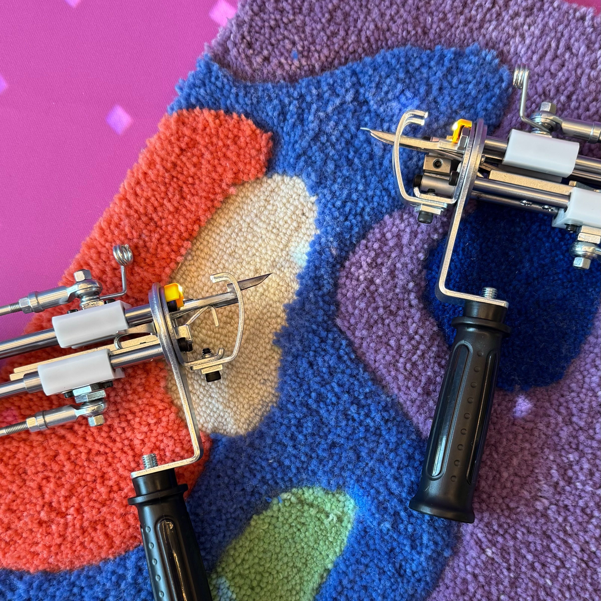 Mit einer Tuftingmaschine stichst du Garn durch ein gespanntes Grundgewebe. Wenn du Punch Needling kennst – die manuelle Variante – funktioniert Tufting ganz ähnlich, aber elektrisch, schneller und für größere Projekte.
