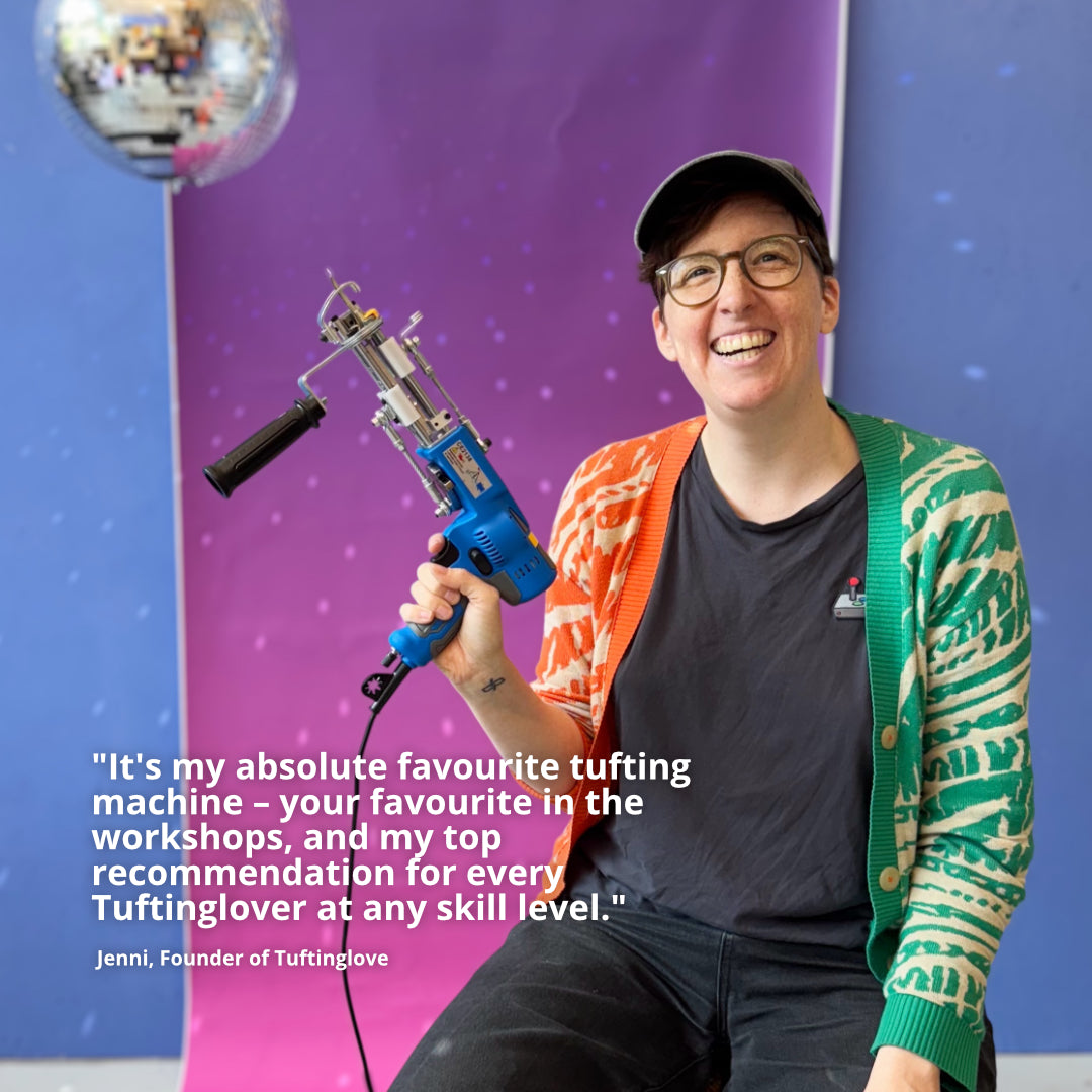Tufting is a modern, three-dimensional textile art technique. You use a tufting machine to punch yarn through a stretched fabric base. If you're familiar with punch needling – the manual version – tufting works similarly but is electric, faster, and allows for larger projects.